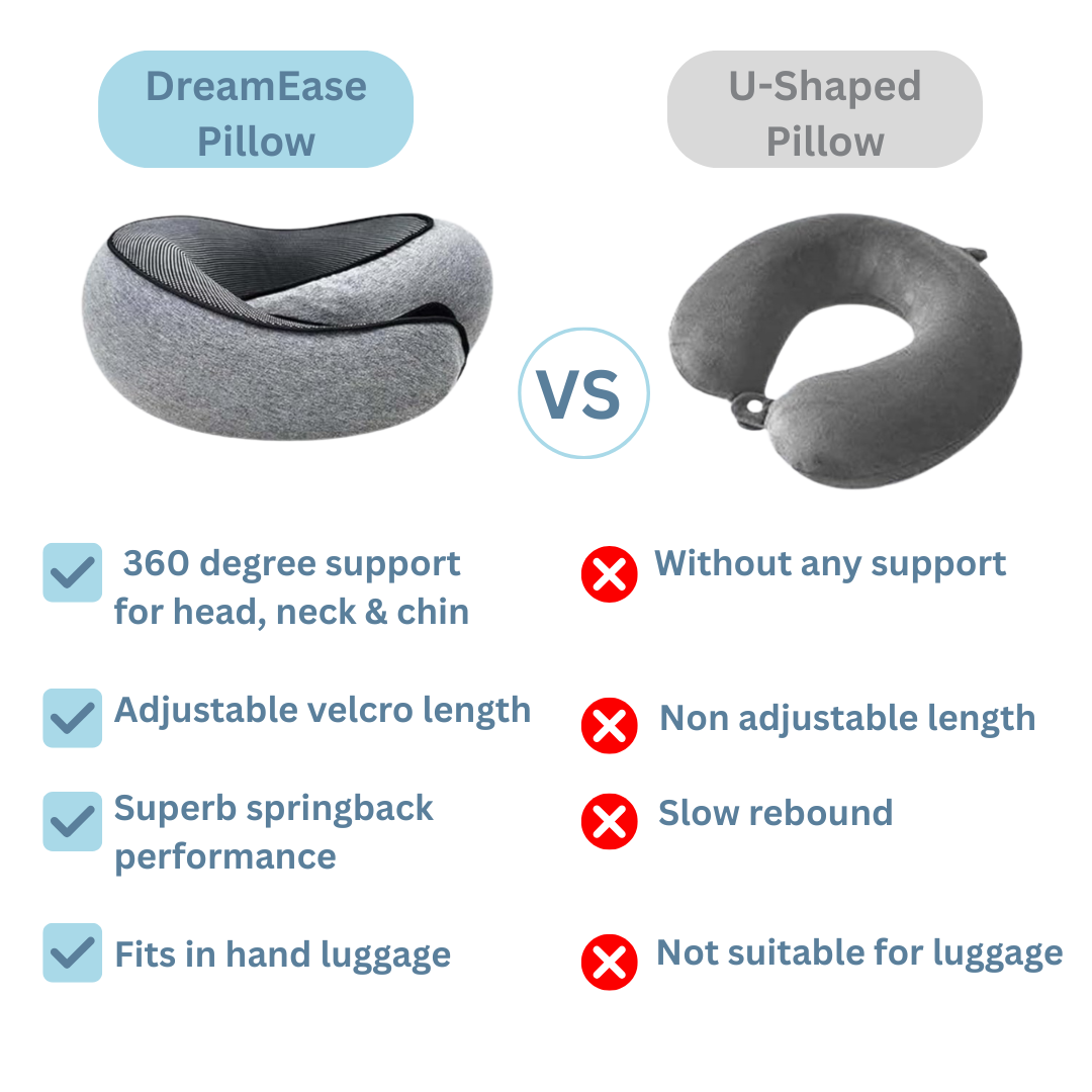 Unlike standard U-shaped pillows that often lack adequate support, the DreamEase Pillow offers 360-degree neck support, minimizing the risk of neck pain and discomfort.